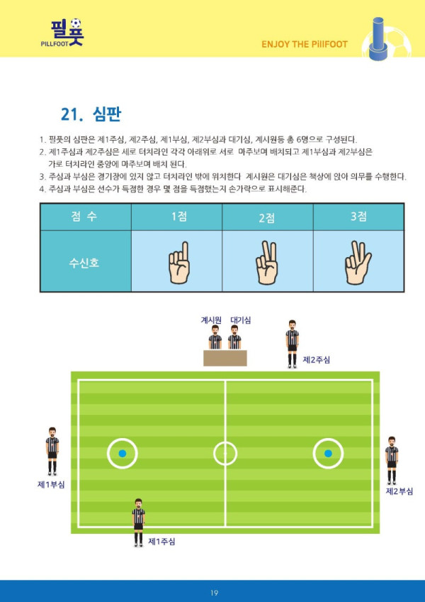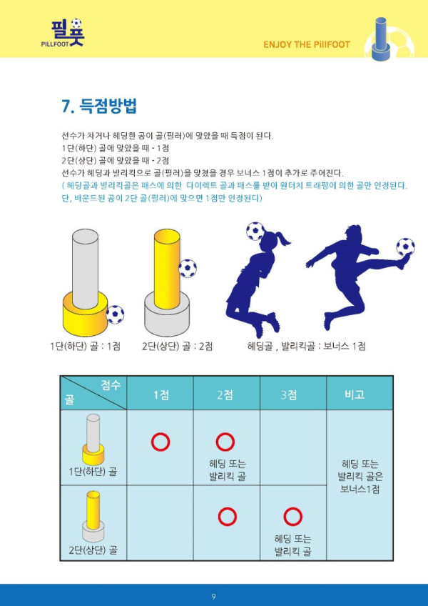 축구와 달리 필풋은 공을 기둥에 맞혀 득점을 내는 경기로 기둥에 맞는 위치에 따라 1점 또는 2점을 득점할 수 있습니다.