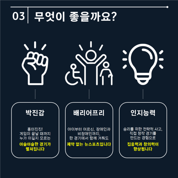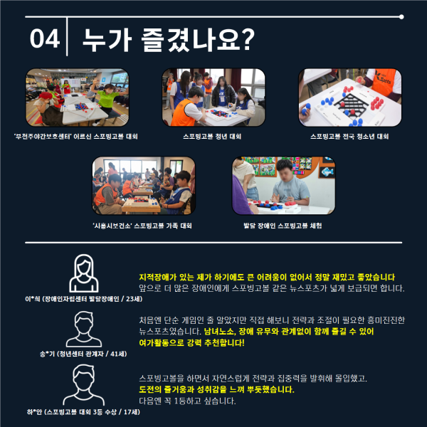 아이부터 청년, 장애인과 어르신까지 푹 빠져있는 스포빙고볼은 손끝의 긴장감이 넘치고, 짜릿한 승부가 펼쳐지는 K-뉴스포츠입니다!