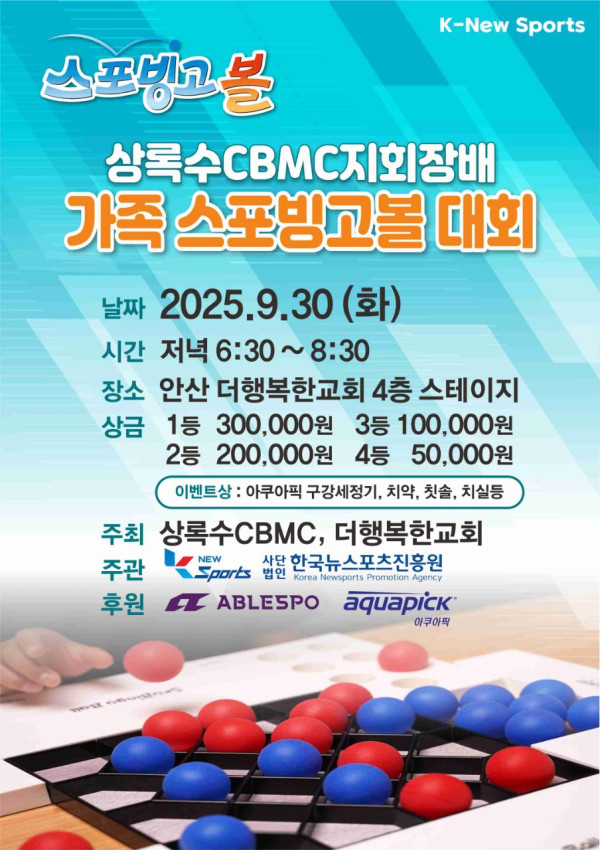 상록수CBMC지회장배 가족 스포빙고볼 대회가 오는 9월 30일 안산 더행복한교회에서 진행됩니다.
